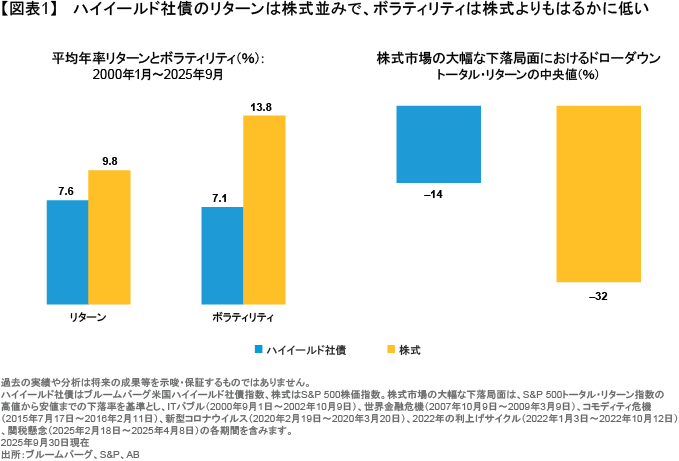 株式ポートフォリオの一部をハイイールド社債に入れ替えることで、投資家はリターンの犠牲を比較的小幅に抑えつつ、ポートフォリオ全体のボラティリティを大幅に低減できる可能性がある。さらに、ハイイールド社債と株式を比較するにあたり、あしもとのリターンとボラティリティのバランスは、債券利回りの高さと経済成長の減速を背景に、通常よりもハイイールド社債が魅力的な環境にあるとABは考える。