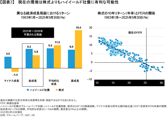 投資家は現状、高リスク株をハイイールド社債に入れ替えることで、それまでと同じかそれよりも高いリターンを長期的に得られる可能性があるとABは見ている。ハイイールド社債はこれまで、経済の低成長局面で株式をアウトパフォームしており、現在はそうした局面の入り口にあると言えるだろう(図表3、左図)。また、歴史的に見て、現在のような高い株価収益率(PER)は、長期的には平均よりも低い株式リターンにつながっており(図表3、右図)、投資家がバリュエーションの上昇を懸念するのも当然と言える。需要のさらなる低迷と世界貿易の落ち込みを前提とすれば(以前の資料『世界景気バロメーター:2025年10-12月期』ご参照)、ハイイールド社債をポートフォリオに組み入れるには今が絶好のタイミングかもしれないとABは考える。