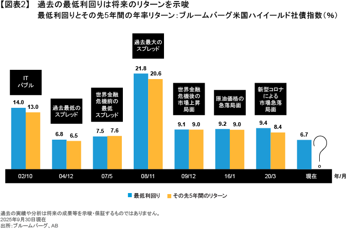 米連邦準備制度理事会(FRB)の金融緩和姿勢への転換にもかかわらず、債券利回りは高止まりを続けている(以前の記事『債券市場の見通し:収穫期に向けた6つの戦略』ご参照)。現在、ハイイールド社債指数の最低利回りは6.7%と、歴史的な高水準にある。トータル・リターンを重視する投資戦略において、高い債券利回りは魅力的なインカムの源泉となり得る。しかもそれは、リターン全体を犠牲にすることを意味しない。実際、ハイイールド社債の最低利回りはこれまで、その先5年間のリターンを示唆する、信頼できる予測指標として機能してきた(図表2)(以前の記事『ハイイールド社債:ボラティリティの高い環境でこそ真骨頂を発揮する』ご参照)。