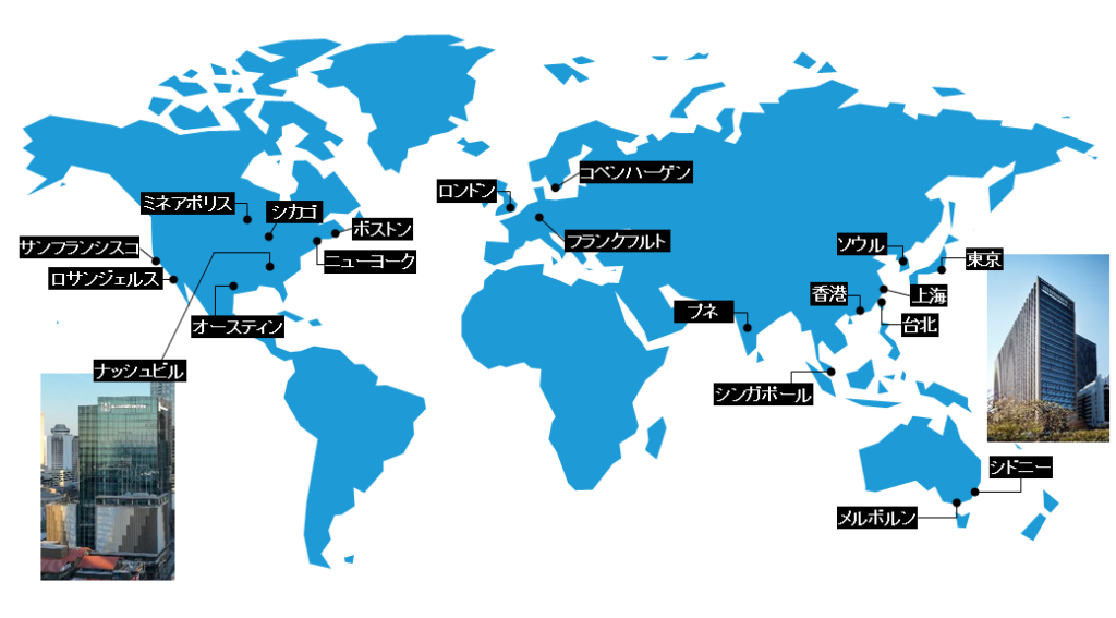 | ナッシュビル シアトル ミネアポリス デンバー サンフランシスコ ロサンゼルス サンディエゴ ダラス オースティン サンアントニオ ヒューストン | トロント クリーブランド シカゴ ボストン スタンフォード ニューヨーク フィラデルフィア ワシントンD.C. アトランタ ウェストパームビーチ マイアミ タンパ | メキシコシティ サンパウロ ブエノスアイレス サンティアゴ テルアビブ ドバイ プネ | コペンハーゲン アムステルダム ストックホルム ダブリン ロンドン フランクフルト ミュンヘン ルクセンブルグ パリ チューリッヒ マドリード ミラノ | 東京 福岡 ソウル 香港 上海 台北 台中 高雄 シンガポール メルボルン シドニー |