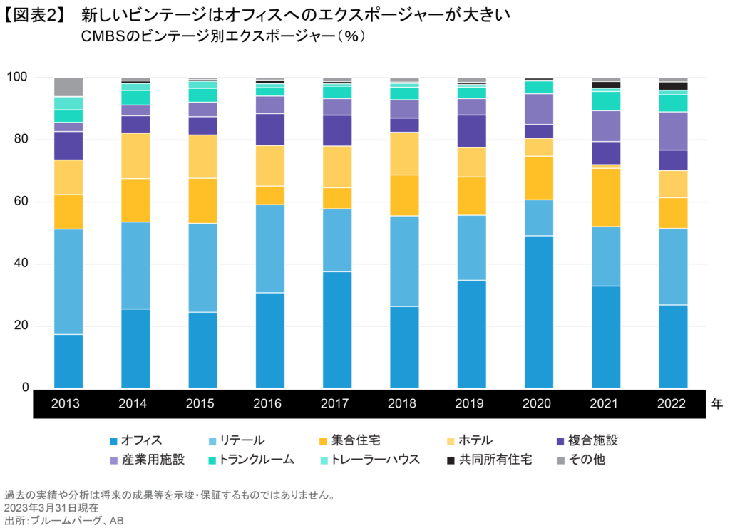 一方、近年組成されたビンテージの裏付不動産は、需要の低下が懸念されるオフィスへのエクスポージャーが大きい(図表2)。また、組成から年数が経過しておらず、裏付資産の価格上昇もほとんど発生していないため、リファイナンスが必要となった場合、困難な状況に陥る可能性がある。よって、近年組成されたCMBSに投資する場合は、最も高いトランシェに選別投資することが重要である。