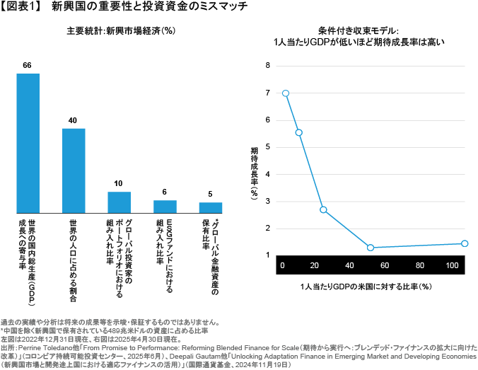 それに加えて、国際通貨基金(IMF)によれば、環境(Environment)、社会(Social)、ガバナンス(Governance)の3つを重視するESGファンドの多くも、新興国市場への投資を避けてきた。この10年、世界経済の成長の大部分は新興国市場が支えてきたにもかかわらず、ESGポートフォリオにおける新興国市場の組み入れ比率は約6%にとどまっている(図表1)。