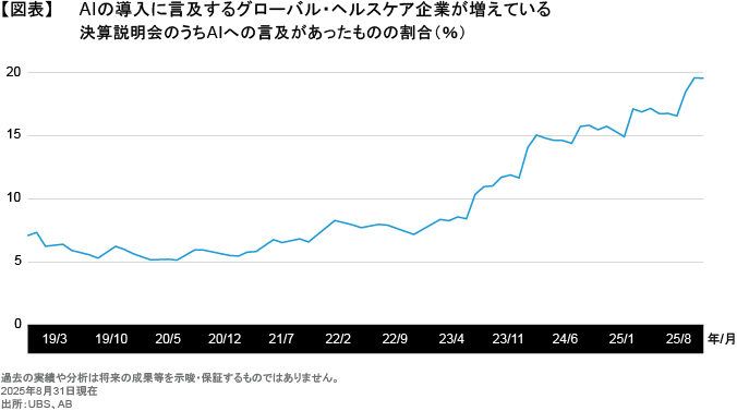 ヘルスケア企業における日々の業務はデータ管理や高い科学技術に依存する部分が大きく、技術の進歩はヘルスケア・セクターとって、常に変化をもたらす要因となってきた。AIはまさに次の波と言えるものであり、薬品の承認にかかる期間の短縮や患者体験の向上、さらには手術支援ロボットや腕に貼るだけでがんを検出できるパッチなど、幅広い分野でAIが活用されつつある。ヘルスケア・セクターにおいては、こうした技術の活用を積極的に進めている企業はまだ比較的少ないものの、決算説明会でAIに言及する企業の割合は増えている(図表)。ヘルスケア企業にとって、AIは差別化の原動力となるものであり、今後数年にわたり、より大きなビジネスの成功や企業の成長、さらには株式リターンの向上につながる可能性があるとアライアンス・バーンスタイン(以下、「AB」)は見ている。