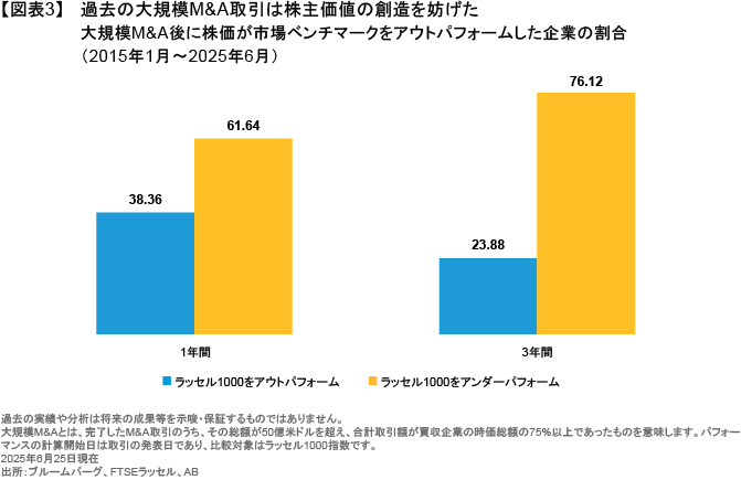 経営陣と株主の利害が最も大きく対立し得る典型例のひとつに、大規模なM&Aがある。ABの分析によれば、規模の大きなM&Aの多くは、株主を犠牲にし、取引を主導した経営陣に利益をもたらしてきたと言える。実際、企業の再編を伴うような大規模な取引のうち、約3分の2は取引後の株価パフォーマンスが市場平均を下回っている。2015年以降に50億米ドル超のM&Aを実施した74社のうち、51社の株価はM&A後の3年間で市場ベンチマークをアンダーパフォームしていたのである(図表3)。