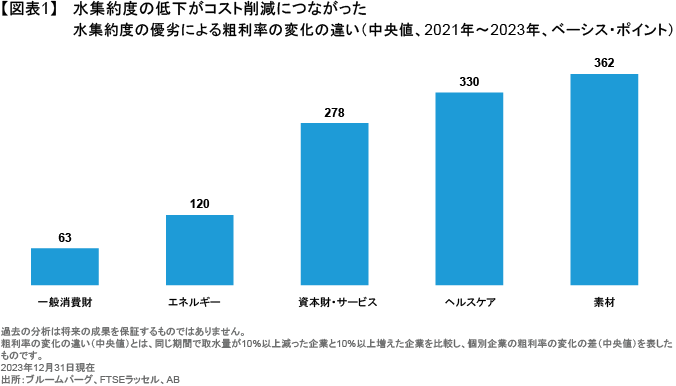 最もデータが充実している2021年から2023年までの期間で見た場合、水集約度(生産1単位当たりの水消費量)が10%以上低下した企業の利益率(中央値)は幅広い業種にわたって拡大ており、拡大幅は、水集約度が10%以上高まった企業群を最大362ベーシス・ポイント(bps)上回っている(図表1)。