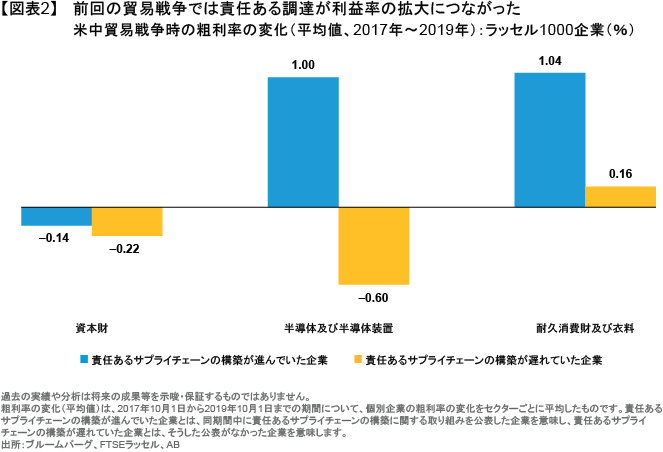 サプライチェーンがどこにあるかだけでなく、サプライチェーン・ショックへの企業の的確な対応力も重要だ。ABの調査によれば、厳格な調達基準を設定していた企業は、2017年から2019年までの米中貿易戦争の期間において、競合他社よりも大きな利益を上げることができていた。輸出企業の中でも、安全な労働環境の監視などの取り組みを行っていた企業の粗利率は、そうした取り組みを行っていなかった企業よりも最大160ベーシス・ポイント(bps)高かったのである(図表2)。地政学的な情勢が今日のように不安定な環境下では、企業間のこうした差が拡大していく可能性があるとABは考える。