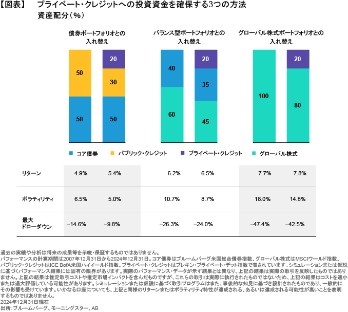 資産担保型プライベート・クレジットの第二の波が市場の裾野を広げ、現代のオルタナティブ運用の要としてのプライベート・クレジットの地位を確かなものにしていると言える。そうした地位にあるプライベート・クレジットは、マクロ環境が変化する中、投資家がポートフォリオの構成を見直す上で、重要な役割を果たすものとなる。プライベート・クレジットへの投資枠を確保することは、ただ時宜にかなうというだけでなく、ポートフォリオに変革をもたらす可能性があるとアライアンス・バーンスタイン(以下、「AB」)は考える。ただし、投資枠の確保に向けて、ポートフォリオの資産配分を再構成するための方法はひとつではない。