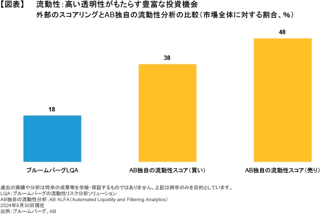 モデルの結果を迅速かつコスト効率良く実際のポートフォリオに反映するためには、包括的な流動性データの活用が特に重要となる。例えばABでは、市場流動性の把握や取引の執行に独自の高度なテクノロジーを活用しており、社債市場の断片的なデータをひとつにまとめることで、外部のツールを利用するよりも早くかつ広く、リアルタイムな流動性情報を手に入れている(図表)。こうした情報の活用が、取引コストの削減や執行タイミングの向上に役立つとともに、今すぐにでも実際に構築可能なポートフォリオの策定に反映されているのである。