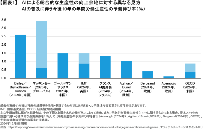 総合的な生産性の向上余地に対する見方には大きなばらつきがあり(図表1)、予測の結果や方法は多岐にわたる。また、実際の影響は生産性以外の要素、例えば具体的なタスクや仕事、さらには産業がAIによる自動化の影響をどの程度受けるかのほか、経済全体にAIがどれだけ広く普及するかにもよるだろう。