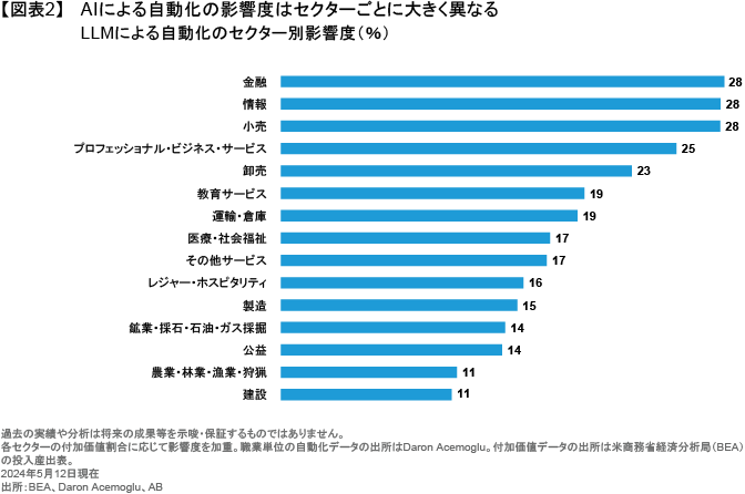 大規模言語モデル(LLM)による自動化の影響度は、コンピューター関連業務や数学的な作業、さらにはオフィス業務や管理業務では70%以上に及ぶとされる一方、建設業や建築・保守・警備サービス業務では20%前後にとどまるとされている。また、この基準によれば、AIの影響度は金融サービス業界が最も大きく、建設業や農業が最も小さい(図表2)。AIがもたらす変革の度合いについては、AIの普及率や雇用への影響に応じて、様々な可能性があると言えるだろう。