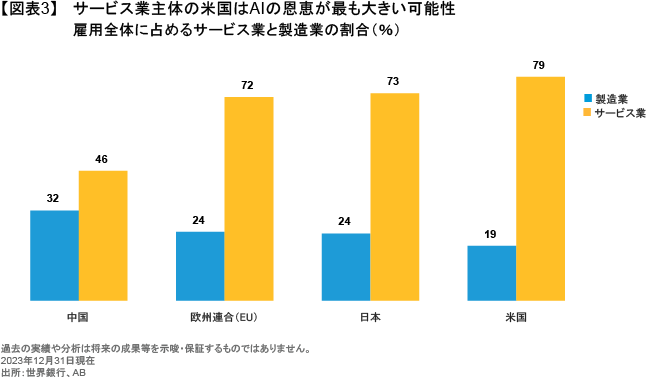 例えば、知識集約型セクターやサービス関連セクターはAIによる自動化の影響が最も大きく、米国は雇用全体に占めるサービス業の割合がほぼ80%と、世界で最も高い(図表3)。こうしたサービス業の割合は、欧州では約70%と米国よりも大幅に低く、中国では46%にとどまっている。
