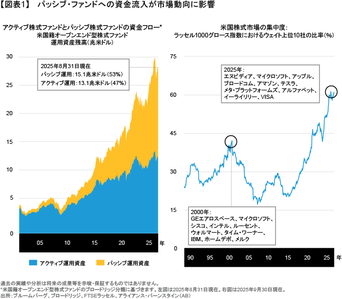 現在の市場は、超大型銘柄への集中が一段と高まりやすい構造になっているように思われる。人工知能(AI)ブームが広がる中、米国株式市場は超大型のテクノロジー銘柄が引き続きけん引している。パッシブ・ファンドは運用資産残高に占める比率が一段と上昇しているため(図表1)、指数との連動を維持するために超大型銘柄を買い続ける必要があり、結果として超大型銘柄の株価がさらに上昇し、市場集中度が高まっている。2025年9月末には、ラッセル1000グロース指数において構成銘柄上位10社の時価総額が全体の61%を占めるに至った。こうした過度な集中への対応として、FTSEラッセルは2025年3月から新たなルールを導入し、自社の米国株指数を構成する個別銘柄の最大ウェイトに上限を設けている。
