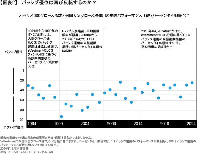 さらに遡ると、パッシブ・ファンド優位の時期が長く続いた後に、最終的に逆転が起こった例もある。1994年から1999年のITバブル期には、バブルの拡大に伴ってパッシブ運用の米国大型グロース株ファンドが特に好調となり、アクティブ運用の米国大型グロース株ファンドの70%をアウトパフォームする場面もあった(図表2)。当時のパッシブ運用の市場シェアは現在よりはるかに小さかったにもかかわらず、こうした状況が発生したのである。その後、ITバブルが崩壊すると、以後8年間の大半でアクティブ運用はパッシブ運用のパフォーマンスを上回った。