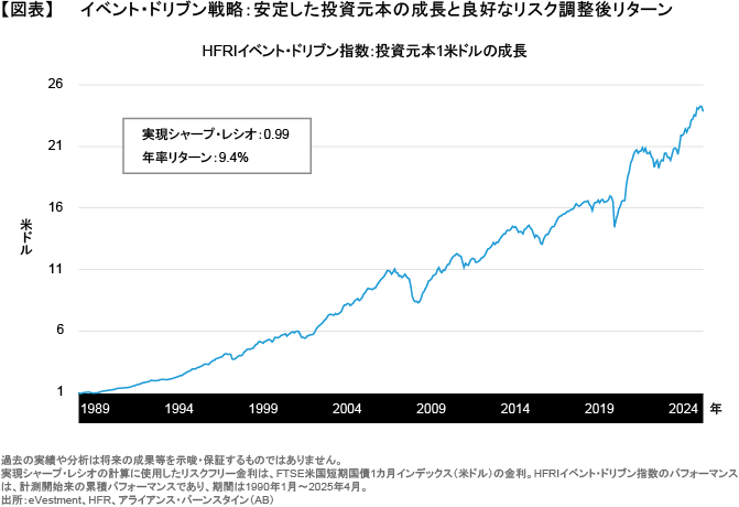 イベント・ドリブン戦略とは、企業にとって重要な出来事、すなわちコーポレート・イベント、あるいは投資家イベントや流動性イベントの発生やその影響を利用し、株価のアノマリー(経験則)からアルファを追求する戦略である。ヘッジファンド戦略の中でも最も古く、研究の進んだ戦略の一つであり、HFRIイベント・ドリブン指数の算出開始日は1990年にまで遡る。それから今日に至るまで、同指数は良好なリスク調整後リターン(年率)を維持しており(図表)、指数が「下落」した年は7回しかない。