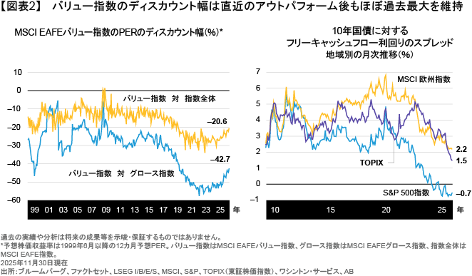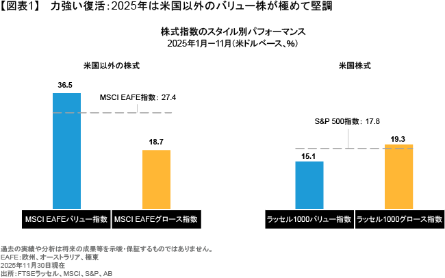 2025年のグローバル株式市場は、日本株と欧州株が米国株をアウトパフォームするなど、驚きに満ちていた。また、非米国市場の中では、MSCI EAFEバリュー指数(米ドルベース)が11月末時点の年初来で36.5%の上昇となり(図表1)、同グロース指数やMSCI EAFE指数全体をアウトパフォームしている。これは米国市場とは正反対の展開であり、米国ではグロース株の優位が今も続いている。