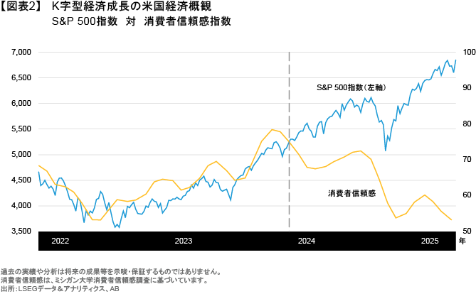 テクノロジー投資の急増は労働市場を犠牲にしてもたらされた。企業は労働者よりもAIを「雇用」することに積極的であり、「K」字型の拡大を生み出している(図表2)。富裕層の財務状況は、企業利益の恩恵を受ける金融資産とともに改善している。これは「K」字型の上昇局面だ。金融資産に投資していない人々、または収入が利益に連動しない人々は、労働市場の軟化に伴い苦戦を強いられる下降局面にある。現在、所得上位10%の層が総消費の約50%を占めており、テクノロジーの進歩によって資本収益率と労働収益率が向上するにつれて、この割合は上昇することが予想される。