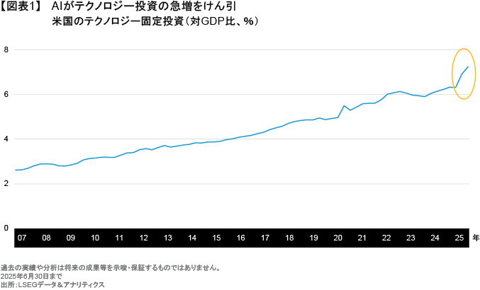 AIが経済に革命をもたらす可能性があることは、現時点では周知の事実であり、企業はその可能性に注目し、資金繰りに注力している。テクノロジーへの固定投資は、長年にわたり着実に増加を続けてきたが、ここ1年で急増し(図表1)、現在、国内総生産(GDP)の7%を超えている。2026年もこの資本配分は続くと予想されるが、AIに多額の投資を行っている企業には、その経済効果を示すよう徐々に圧力が強まっていくだろう。