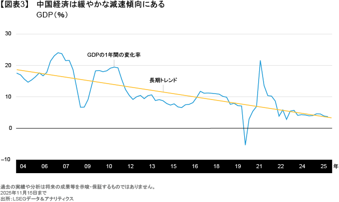 米国以外では、新たな関税制度への対応が2025年のトップニュースとなり、2026年も続く可能性が高い。中国は高齢化が進む中、依然として緩やかな経済減速傾向にあり(図表3)、政策当局はさらなる課題に直面している。政策当局は主に、輸出先を米国から他のアジア諸国、南米、欧州に振り向けることで成長軌道を維持している。