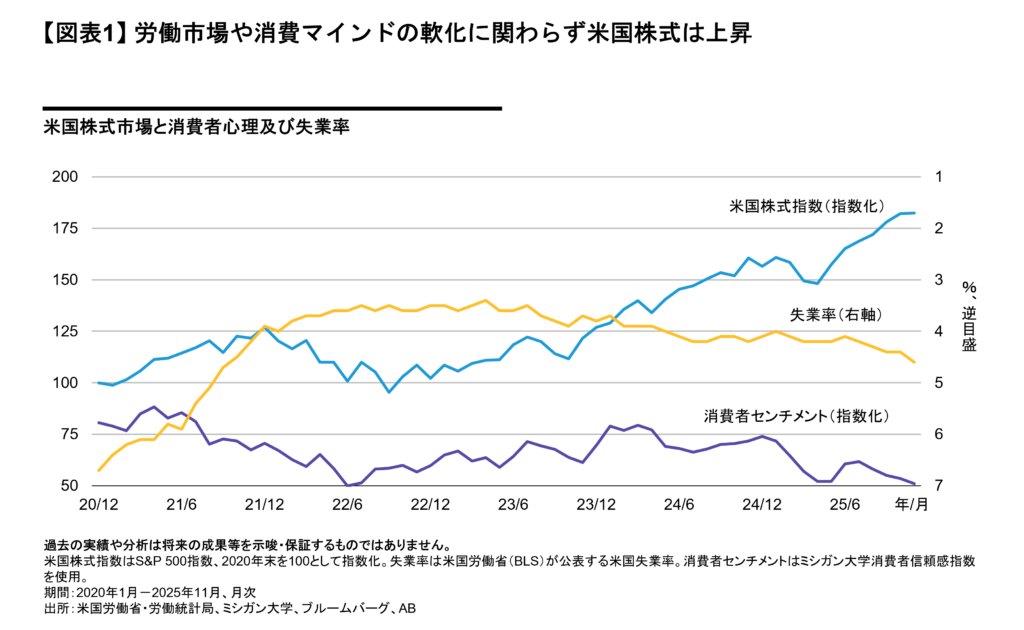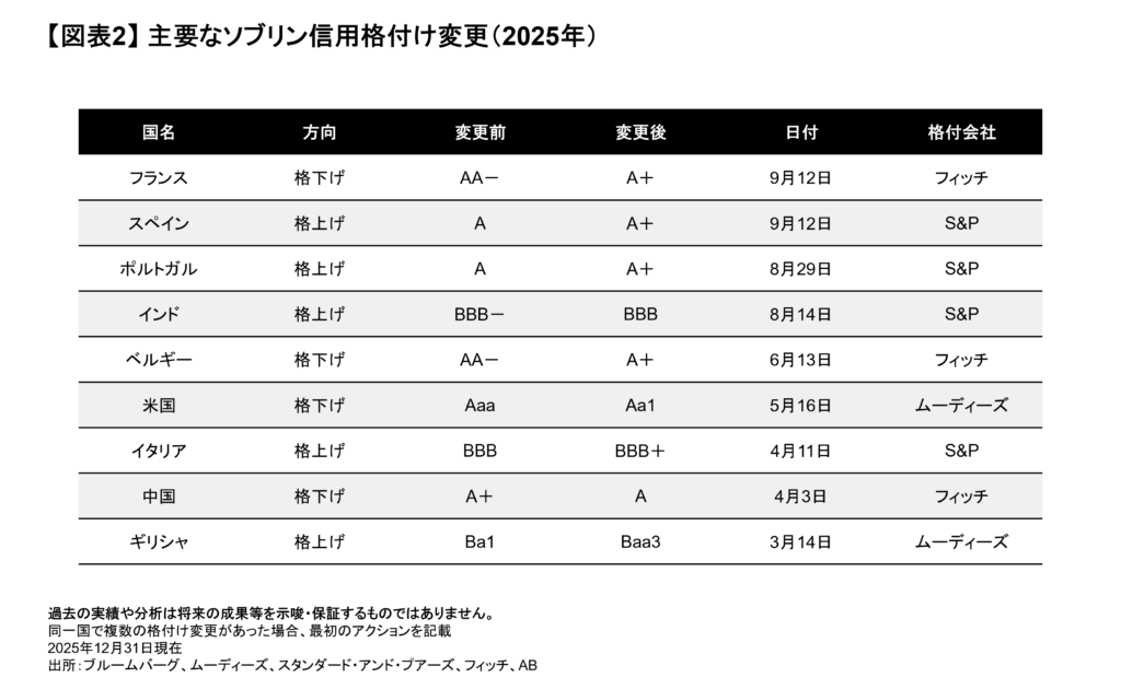 当資料は、2026年1月7日現在の情報を基にアライアンス・バーンスタイン株式会社が作成した資料であり、いかなる場合も当資料に記載されている情報は、投資助言としてみなされません。当資料は信用できると判断した情報をもとに作成しておりますが、その正確性、完全性を保証するものではありません。また当資料の記載内容、データ等は今後予告なしに変更することがあります。当資料で使用している指数等に係る著作権等の知的財産権、その他一切の権利は、当該指数等の開発元または公表元に帰属します。当資料中の個別の銘柄・企業については、あくまで説明のための例示であり、いかなる個別銘柄の売買等を推奨するものではありません。当資料中の格付けは、特に記載のない限りABの定義に基づきます。アライアンス・バーンスタイン及びABはアライアンス・バーンスタイン・エル・ピーとその傘下の関連会社を含みます。アライアンス・バーンスタイン株式会社は、ABの日本拠点です。