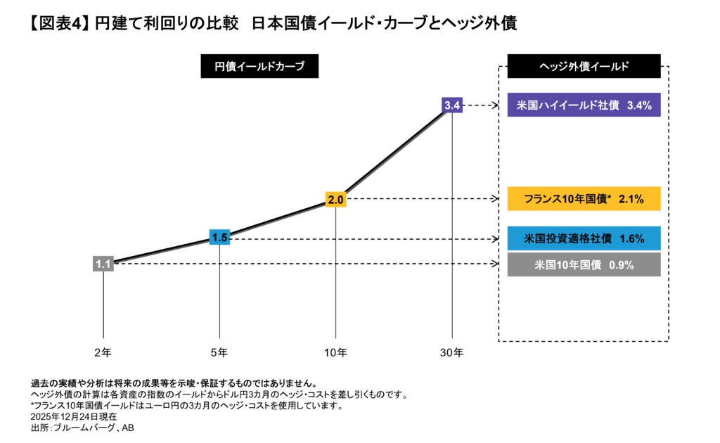 2025年にアセットとして最も変貌を遂げたのは円債だろう。長期金利の水準は10年国債で2.00%、30年国債は3.00%を超えるなど、他の先進国と遜色のない水準となった。金利の水準感をつかむため、ヘッジ外債と円債の円建て利回りを比較した(図表4)。年限が伸びるほど、より低位のクレジット・セクターなみの利回りとなっており、円ベースでみると超長期年限は米国ハイイールド社債に匹敵する利回り水準だ。日本のソブリン格付けがシングルA格であることを踏まえると、日本国債はもはや売られすぎの状態とも解釈できる。