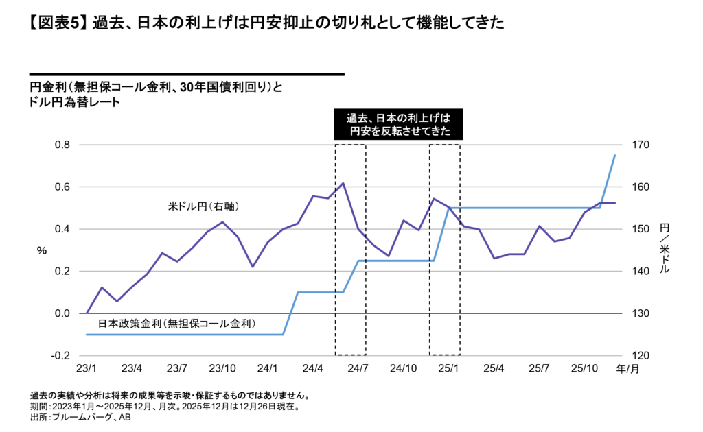より長期的に円債の需要を左右する要素を考えると、円安による輸入インフレ圧力への懸念に行きつく。ここ数年は円の国際的な評価が非常に厳しく、円安がインフレを招いているからだ。2023年以降の日本の利上げはいずれも円安をけん制してきた(図表5)。ただし、直近25年12月の利上げは、日本国債売りと円売りが止まらない「利上げの無駄遣い」だった可能性もある。また、日本経済にとって政策金利0.75%は既に未知の領域で、経済へのインパクトを十分検証する必要もある。今後の利上げは相当慎重になるとABではみている。