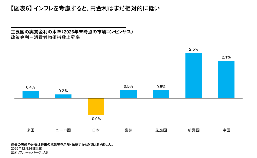 日本円は2021年以降ほぼ毎年円安になっており、極端に弱い通貨になった。その背景には複合的な要因がある。まず、他国よりも抜けて低い日本の実質金利である。米国はじめ他の多くの国に逆行して日本は利上げを進めているが、それでも物価上昇率を勘案すると日本の短期金利はまだまだ低いのが実情だ(図表6)。