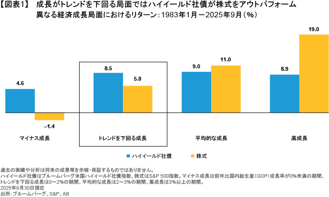 しかし、投資対象の選別が必要だからといって、投資適格未満の債券を回避するべきだという意味ではない。実際、堅調な2025年を終えた株式からのリバランスを検討している投資家にとっては、ハイイールド社債が重要な役割を果たす可能性があるとABは考える。過去を見ると、ハイイールド社債は株式よりもはるかに低いボラティリティで、株式並みのリターンを上げており、中でも低成長の環境下において、総じて株式をアウトパフォームしてきた(図表1)。そのためハイイールド社債は、期待リターンを大きく犠牲にすることなく、ポートフォリオの株式ボラティリティを抑えたい投資家にとって、補完的な資産クラスとしての信頼性が高いとABは見ている(以前の記事『バランスの追求:ハイイールド社債の組入れによる株式ボラティリティの低減』ご参照)。