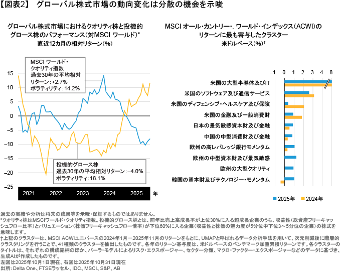 2025年の劇的な展開の背景には以下の3つのトレンド、すなわち4月の関税ショックとそこからの素早い立ち直り、AIをめぐる熱狂と市場集中度の高まり、そして投機的なグロース相場の中で、クオリティ株が大きくアンダーパフォームする一方、地域別・スタイル別パフォーマンス格差の拡大があった(図表2)。一方、市場の主役は引き続きAI関連のテクノロジー・セクターであったものの、ABのクラスタリング分析によれば、市場の動向には変化も見られ、米国、欧州、アジアのより幅広いセグメントが2025年の市場リターンに寄与した。