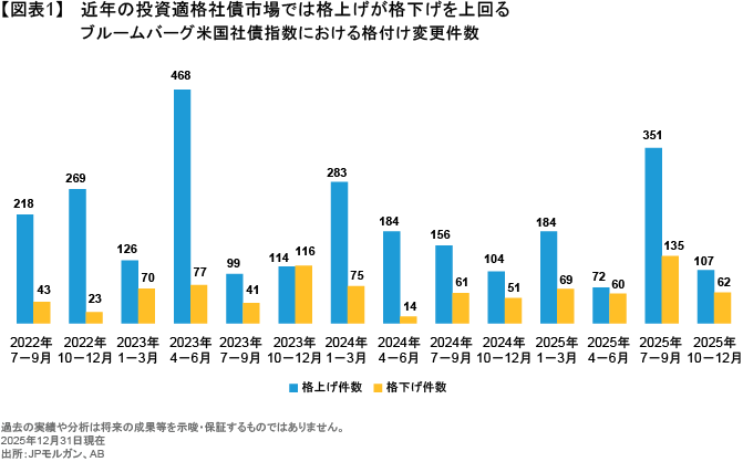 2026年は企業ファンダメンタルズの悪化と銘柄間格差の拡大が明らかになる、転換の年になるとABは見ており、AI投資はそうした状況に拍車をかける可能性がある。ここ数年の投資適格社債市場では、資本の充実したハイパースケーラー企業の市場占有率が徐々に高まる中、格上げ件数が格下げ件数を大きく上回ってきた(図表1)。