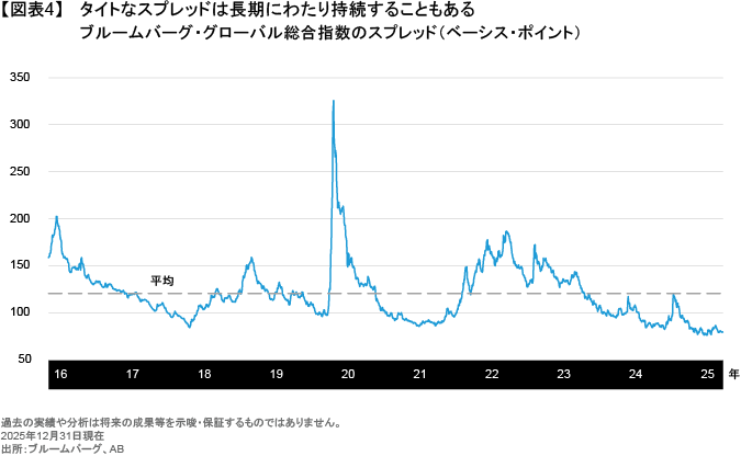 タイトな水準にあるクレジット・スプレッドは、一見すると厄介な問題であり、クレジットのリターンにとって逆風となる可能性があるように思われる。それでも投資家は、タイトなスプレッドを理由にクレジット投資を避けるべきではないとABは考える。タイトなスプレッドは主に長期年限の社債における問題であり、またクレジット・スプレッドには、一度縮小するとそのままレンジ内にとどまるという傾向もある(図表4)。加えて、現在の利回り水準は、投資適格もハイイールドも過去に比べて高い状態を維持しており、既に高いクーポン収入が大きな役割を果たすことで、金利ボラティリティに対するクッションを提供すると考えられる(以前の記事『ハイイールド社債:ボラティリティの高い環境でこそ真骨頂を発揮する』ご参照)。