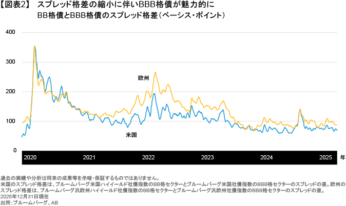 BB格債はこの1年、利回りの高止まりと低いデフォルト・リスクを背景に安定したパフォーマンスを見せており(以前の記事『ハイイールド債:退屈な投資こそが良い場合も』ご参照)、そうした傾向が2026年も続くとABは見ている。また、ハイイールド債への投資には慎重な投資家にとって、BBB格債は魅力的な代替となる可能性がある。実際、BBB格債の多くは現在、BB格債並みかそれ以上の利回りを有しており、特に米国においてはより高いリターンをより低いリスクで追求することができる、恵まれた環境を投資家に提供していると言える(図表2)。