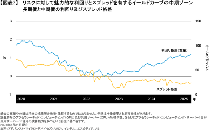 ここ最近の米国債では長期債と短期債の金利差が拡大しており、投資家は投資対象とする年限の長期化に魅力を感じているかもしれないが、ABは中期年限の債券により注目すべきであると考える。ABの分析によれば、イールドカーブの中期ゾーンはレラティブ・バリュー、利回り、そしてスプレッドという3つの観点から、魅力が高いと考えられる(図表3)。簡単に言えば、リスクに対する投資家の期待リターンは、ABの考えではイールドカーブの中期ゾーンが最も高いということだ。