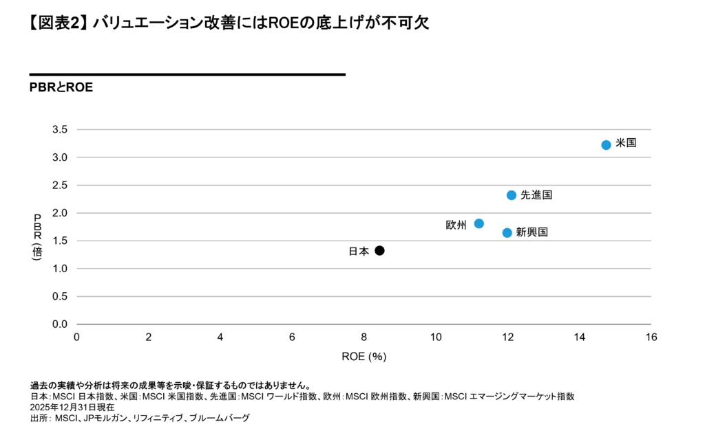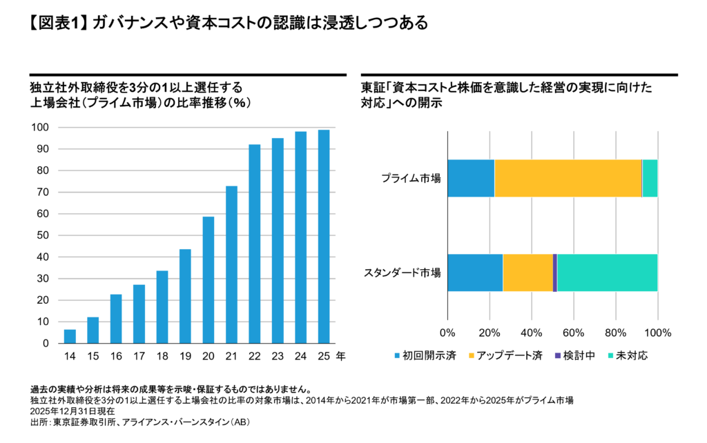 こうしたインベストメント・チェーン全体への働きかけは、一定の成果を生みつつある。たとえば、独立社外取締役を3分の1以上選任する企業はプライム市場で98%超(2025年12月末時点)に達し、東証が求める「資本コストと株価を意識した経営」に関する開示も93%の企業が実施済みだ(図表1)。また、TOPIX構成企業におけるPBR1倍割れ企業の割合は、一時の50%超から2025年末には3割台まで改善し、バリュエーションにも変化が表れ始めている。