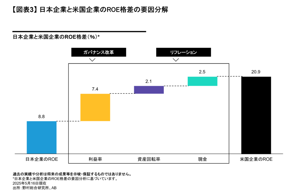 こうした状況は、株価バリュエーションにも反映されている。日本企業の平均PBRは1.3倍(2025年12月末時点)と、先進国平均の2.3倍を大きく下回る(図表2)。背景には自己資本利益率(ROE)の低さ(8.8%)や利益率の見劣りがある(図表3)。ABは、ガバナンス改革を通じてROEを改善し資本効率を高めることこそが、企業価値向上の重要な鍵であると考えている。
