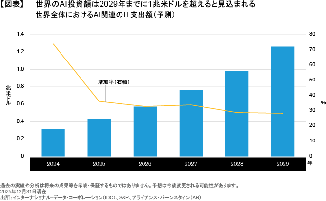 AI投資の拡大が加速するにつれ、産業の基盤となるデータセンター、電力インフラ、さらには送電網といった分野に対して、巨額のAI関連資本が流れ込んでいる。S&Pによれば、世界全体のAI投資額は、2029年までに1兆米ドルを超える可能性がある(図表)。