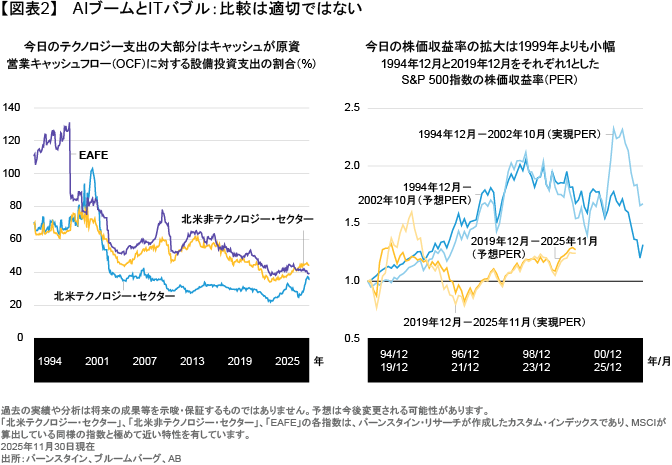 これらの動きには注意が必要であるものの、AI主導の上昇相場を支える根拠は今のところ揺らいでいないとABは考える。設備投資の増加はその大半が過剰なレバレッジではなく、安定した営業キャッシュフローによって賄われているためだ(図表2)。また、市場による選別も働いていると見られ、持続的な収益力のある企業は高く評価される一方、バランスシートがぜい弱な企業は低い評価を受ける傾向にある。これが示しているのは、無差別ではなく合理的な投資家の行動だ。