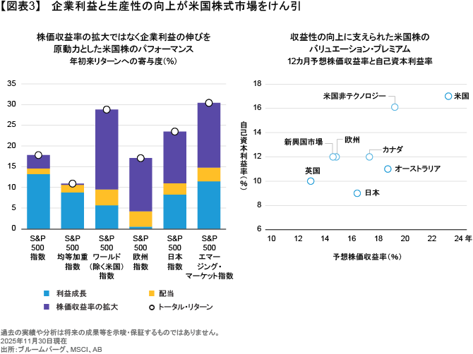 米国株を選好しつつ、新興国市場株式による補完を図る。米国株の現在の株価収益率は、収益性の向上と引き続きトレンドを上回る利益成長を適切に反映したものであり、他の先進国株に対して米国株をオーバーウェイトする理由はある(図表3)。その一方で新興国市場株式は、ポートフォリオに分散効果をもたらすとともに、とりわけ世界のAIバリューチェーンにとって重要な国々を中心に、各国の金利低下や企業利益の改善、さらには米ドル安の可能性という追い風を受けると考えられる。