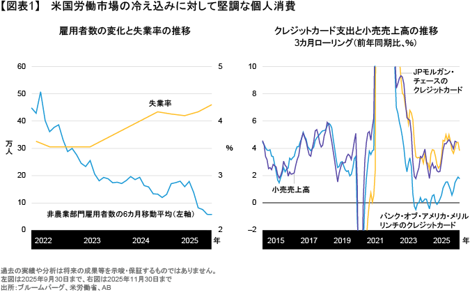 ABの見方では、今後も個人消費が経済の安定を支える重要な要素になると考える。家計のバランスシートはそれほど大きく拡大しておらず、実質賃金もプラスの伸びを維持する中、超過貯蓄は減少しながらもまだ残ったままである。また、インフレは目標を若干上回っているものの、労働市場の最近の悪化を受け、FRBは雇用リスクにより重きを置くとABは考えている(図表1)。FRBはおそらく2026年も金融緩和を続け、財政政策についても、直近の支出策の効果が前倒しで現れ、年後半まで経済活動を下支えしていくことで、当面は追加的なクッションとしての役割を果たすだろう。