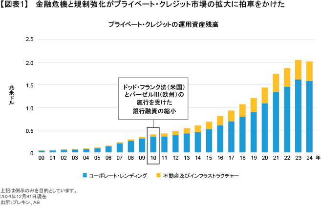 プライベート・クレジットとは、簡単に言えば、銀行システムの外で行われる融資のことである。かつては非金融企業向け融資のごく一部にすぎなかったプライベート・クレジットは、世界金融危機以降、銀行のリスクテイクに対する当局の規制強化を背景に拡大し始めた。米国のドッド・フランク法(金融規制改革法)や世界的なバーゼルIII規制の施行を受け、銀行の自己資本規制が強化されたことで、銀行による融資が縮小し、その隙間を埋めるように資産運用会社や保険会社、さらにはその他のプライベート・レンダーによる融資が積極化したのである(図表1)。