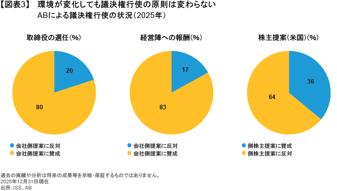 ABは2025年、参加した株主総会の57%において、少なくとも1件の会社側提案に反対票を投じている(図表2)。また、同じく45%の株主総会において、ABはISSの推奨とは異なる投票を行った。