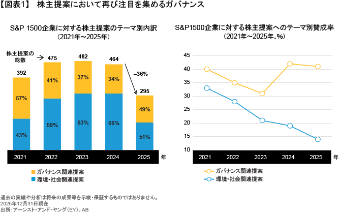 さらに、提案を行う株主は別の新たな規制変更によっても制約を受ける可能性がある。SECは2026年1月、株主勧誘通知の提出手段を縮小し、保有株式500万米ドル未満の株主が提出する任意書類を今後は受け付けないとした。これにより、保有額が少ない株主提案者は補足資料を EDGAR(SECの電子開示システム)に掲載することが難しくなり、株主提案の背景にある主張を補強したり、反対投票を呼びかけたりするのにこれまで多く利用されてきた手段が制限されることになる。ABの見方では、こうした変化の結果、議決権行使シーズン中に公開提出される補足資料の数は減少し、反対投票運動の勢いも抑えられることになるだろう。また、株主提案者はメディアへの働きかけと投資家との直接対話をより重視するようになる可能性があることから、株主の声を企業に届けるためのコスト面と調整面でのハードルは、今よりも高くなると考えられる。