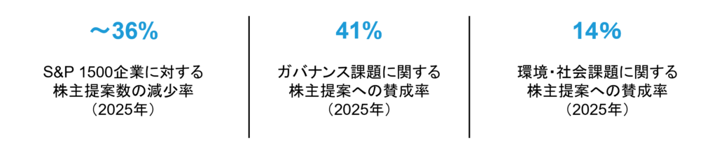 2020年から2024年にかけて、ESG(環境・社会・ガバナンス)の中でも「E(環境)」と「S(社会)」に対する関心の高まりを追い風に、株主提案の件数は着実な増加基調をたどってきた。一方、2026年の議決権行使シーズンは、2025年に起きた株主提案関連を含む様々な規制・法的環境の変化を受けて初めての年となる。