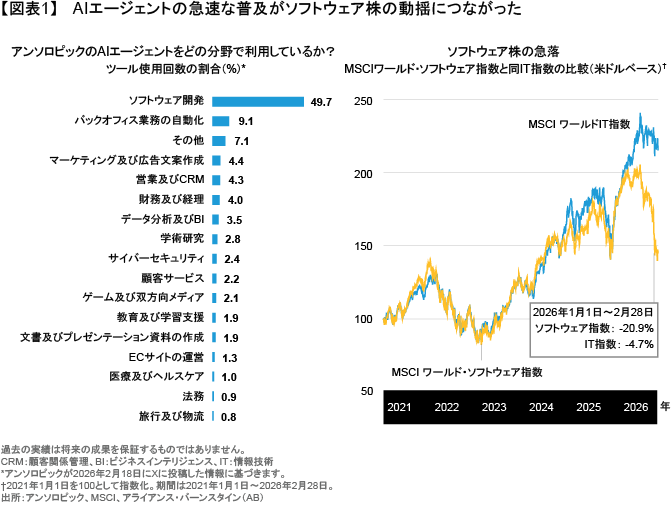 ChatGPTの登場以降、ソフトウェア株には厳しい目が向けられてきた。そしてここ数カ月は、Claude Opus 4.5やClaude CoworkといったAIコーディングモデルの発表を受け、より高性能なAIエージェントの大規模な普及(図表1)が、開発コストや参入障壁の低下によるソフトウェアのコモディティ化につながるのではとの懸念が強まっている。またそうした中で、MSCIワールド・ソフトウェア・サービス指数の2026年初来リターンは、2026年2月末時点において20%を超える急落となっている。