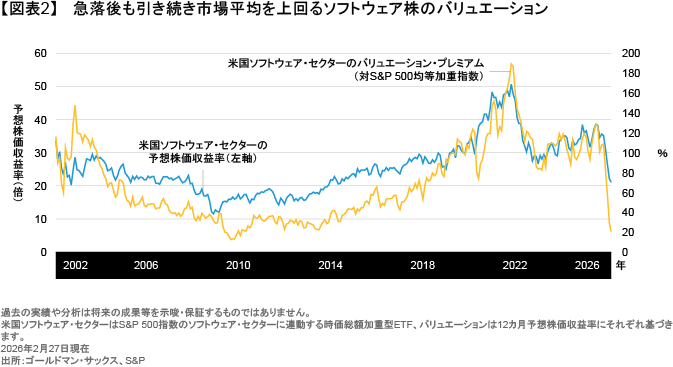 アプリやエージェント、さらにはデータやインフラストラクチャーなど、AIスタック(製品群)全体のどこに価値が生まれるか、本当のところは誰にも分からない。だからこそ、市場はソフトウェア株に適用する割引率を全体的に引き上げ、それがソフトウェア株のバリュエーションの低下につながったのである(図表2)。ソフトウェア企業の株価は下落しているものの、顧客の行動や顧客維持率の指標、あるいは公表されている財務諸表に関して言えば、経営上のストレスの兆しはほとんど見られない。