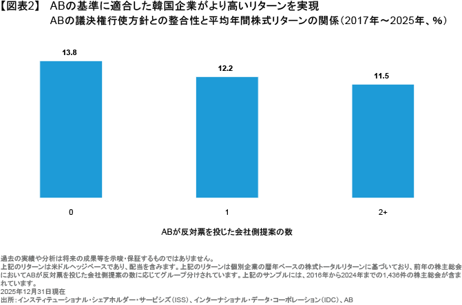 こうしたアプローチの有効性は、韓国におけるABの議決権行使実績、すなわち会社側提案に対するABの賛成状況(ガバナンスの質を示す指標)と企業の株価パフォーマンスとの関係からも見て取れる。この分析では、ABが反対票を投じた会社側提案の数(VAM)に応じて企業を均等ウェイトのバスケットにグループ分けし、各バスケットの翌年の平均株式リターンを算出した。その結果、ABのガバナンス基準を十分に満たしている、すなわちVAMが0件であった企業グループの翌年の平均パフォーマンスは、VAMが2件以上であった企業グループを年間200ベーシス・ポイント超上回っていた(図表2)。