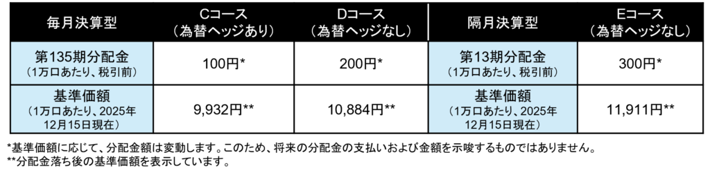 アライアンス・バーンスタイン・米国成長株投信Cコース毎月決算型(為替ヘッジあり)予想分配金提示型(以下、Cコース)/Dコース毎月決算型(為替ヘッジなし)予想分配金提示型(以下、Dコース)/Eコース隔月決算型(為替ヘッジなし)予想分配金提示型(以下、Eコース)は、2025年12月15日決算の収益分配金を以下のとおり決定しましたのでお知らせします。