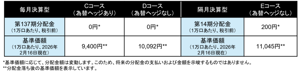 アライアンス・バーンスタイン・米国成長株投信Cコース毎月決算型(為替ヘッジあり)予想分配金提示型(以下、Cコース)/Dコース毎月決算型(為替ヘッジなし)予想分配金提示型(以下、Dコース)/Eコース隔月決算型(為替ヘッジなし)予想分配金提示型(以下、Eコース)は、2026年2月16日決算の収益分配金を以下のとおり決定しましたのでお知らせします。