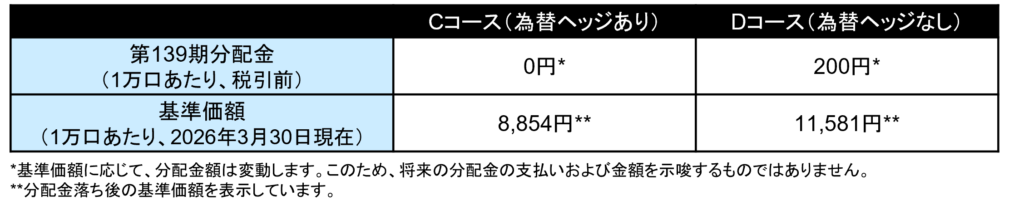 アライアンス・バーンスタイン・新興国成長株投信Cコース毎月決算型(為替ヘッジあり)予想分配金提示型(以下、Cコース)/Dコース毎月決算型(為替ヘッジなし)予想分配金提示型(以下、Dコース)は、2026年3月30日決算の収益分配金(1万口あたり、税引前、以下同じ)を以下のとおり決定しましたのでお知らせします。